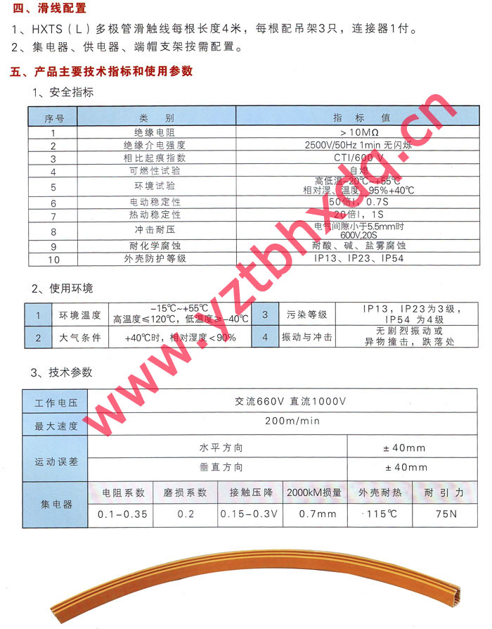 注:1、滑触线标准长度:4m、6m。 2、滑触线极数:3-6极。 3、HXTS与HXTL相同,前者外壳为塑料,后者外壳为铝合金。