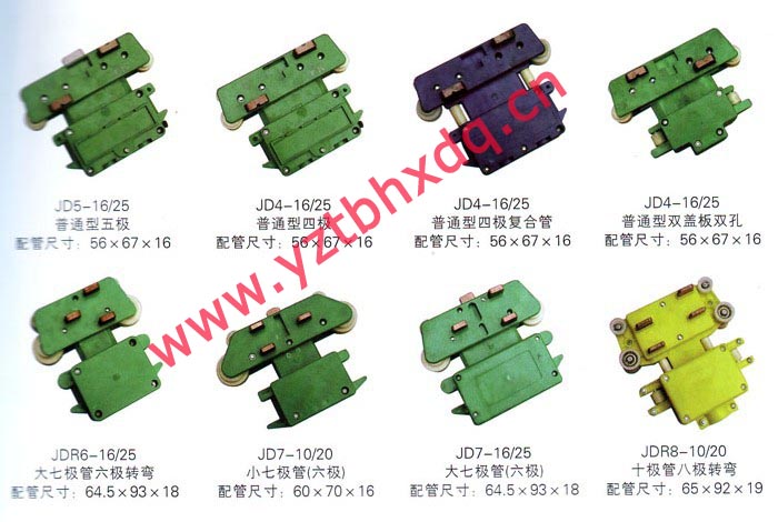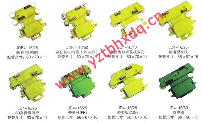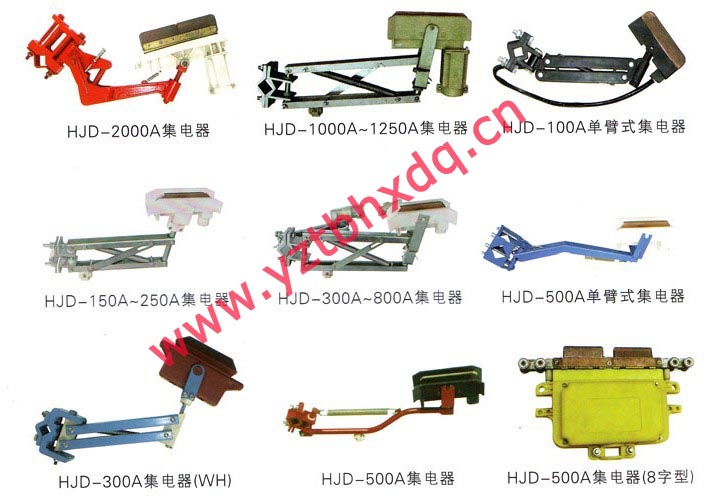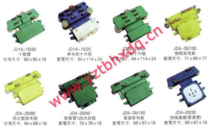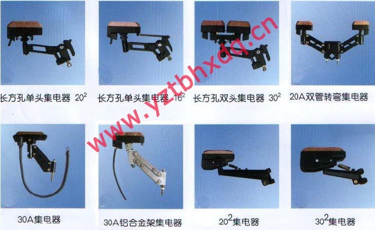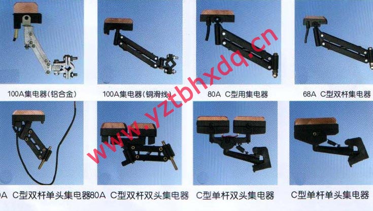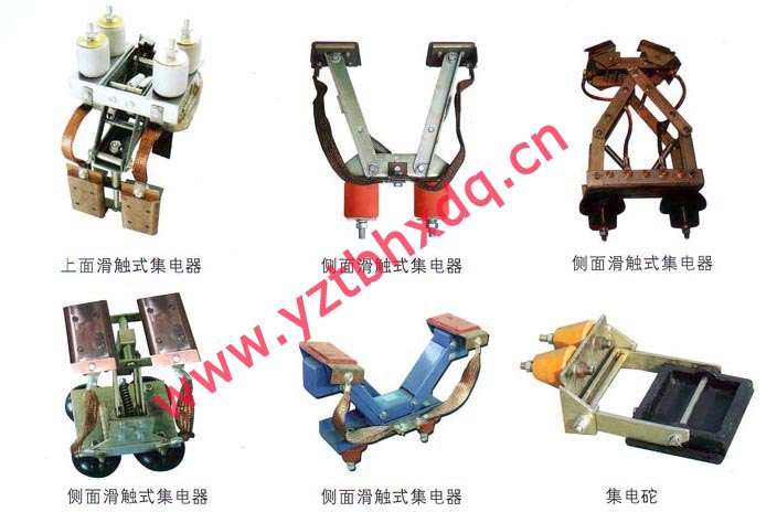 集电器是滑线系统中最主要的部件之一. 集电器是滑触线系统中集电侧拾取电能的主要装置,它通过集电刷与导轨的滑动接触,将电能直接传导至用电器,从而实现系的移动供电.集电器由机械结构和张力装置和直接与导轨滑动接触的集电刷两部分组成. 机械结构和张力装置决定集电刷与导轨的滑动接触压力和机构的稳定性.集电刷则电导轨滑动接触拾取电能的导体,它的性能与导电质量以及材料结构成份的优劣,将直接影响整个系统的安全运行质量.